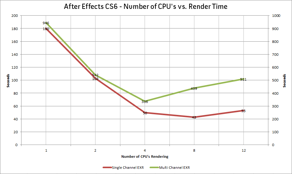 In the graph below you'll see a performance curve where on the left is 1 CPU and render time falls / rises as the Multiprocessing CPU count is upped to 12. For my machine going past 4 CPU's is a waste of RAM and generally slower (50% slower in the multi channel EXR test) when run all the way at 12 CPU's. Performance won't be the same for everyone due to differences in network, cpu, drives, etc; use this opportunity to run some tests yourself - I think you'll be surprised by your results.